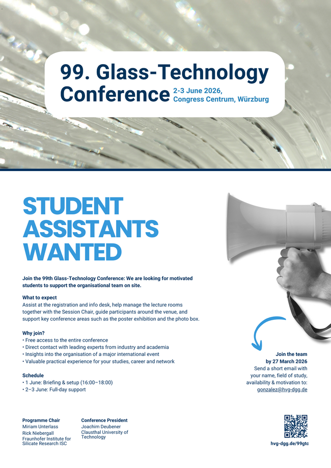 Please include: Your name, field of study, your availability on 1–3 June 2026 and motivation for supporting the 99th Glass-Technology Conference