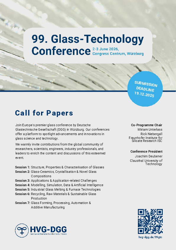We are excited to announce the Call for Papers for the upcoming Glass-Technology Conference 2026, a focal gathering for professionals and researchers in the glass science and technology community. We invite you to contribute your research, insights, and innovations related to the following sessions: