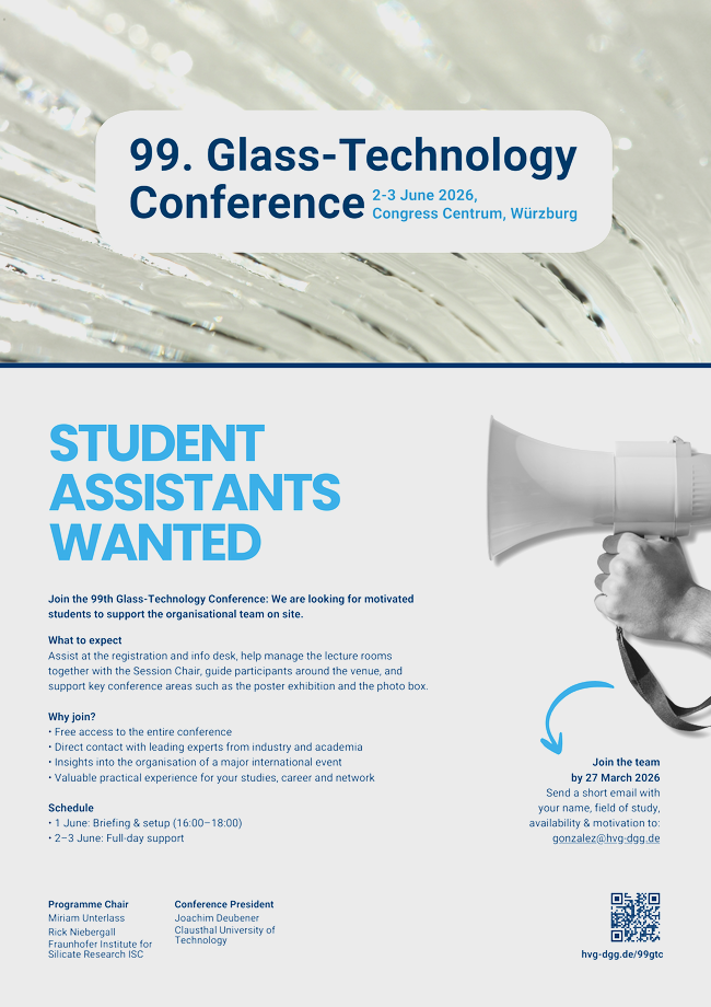 Please include: Your name, field of study, your availability on 1–3 June 2026 and motivation for supporting the 99th Glass-Technology Conference